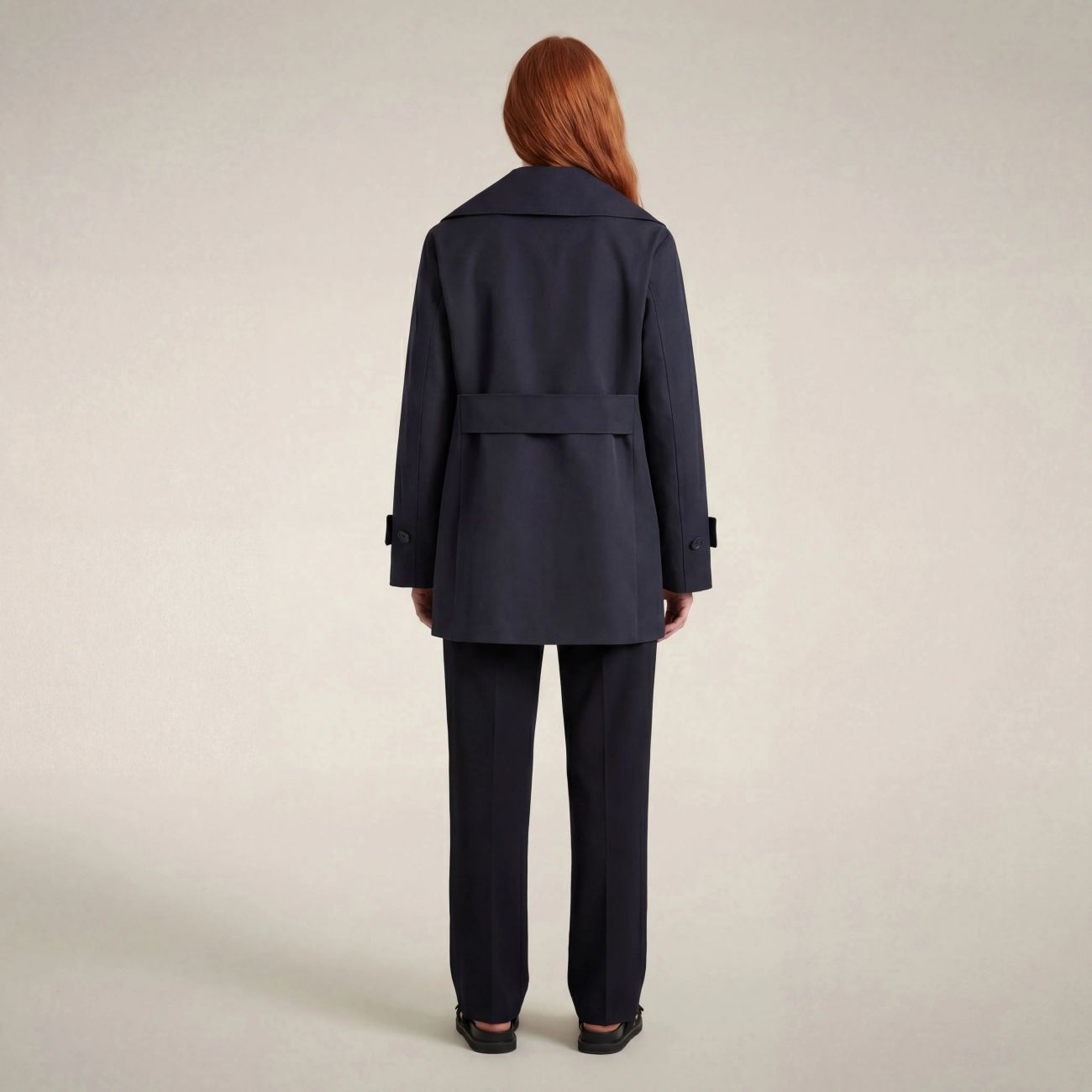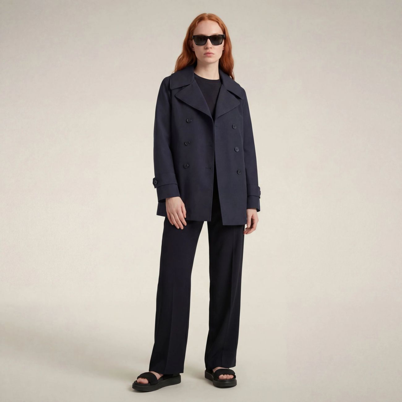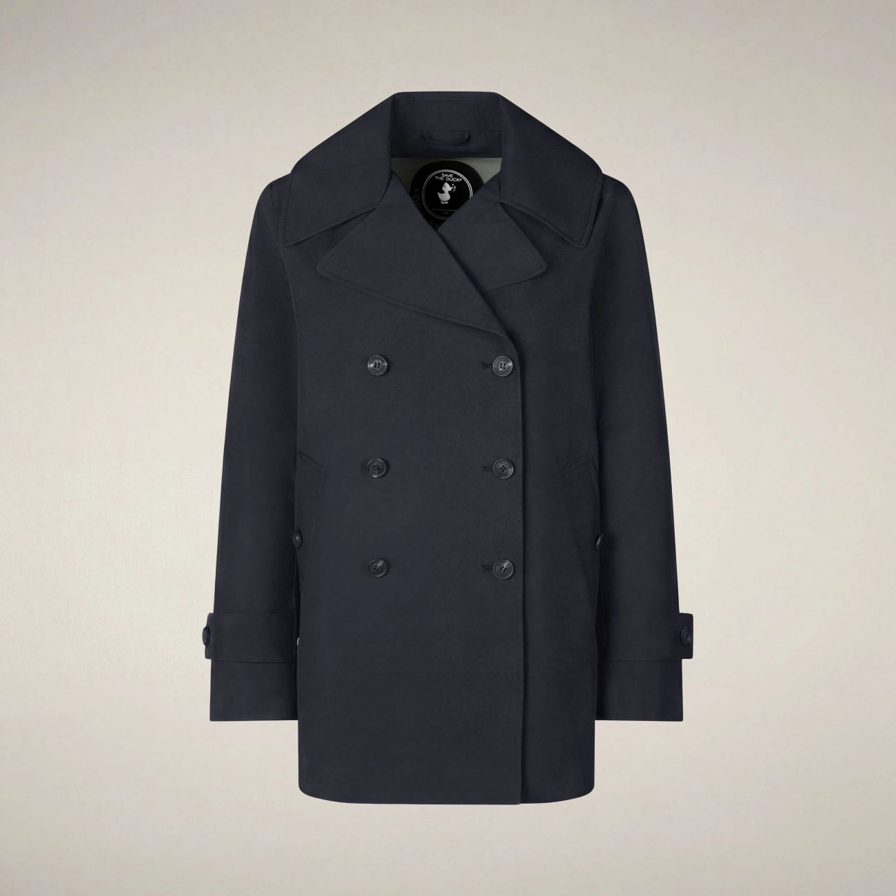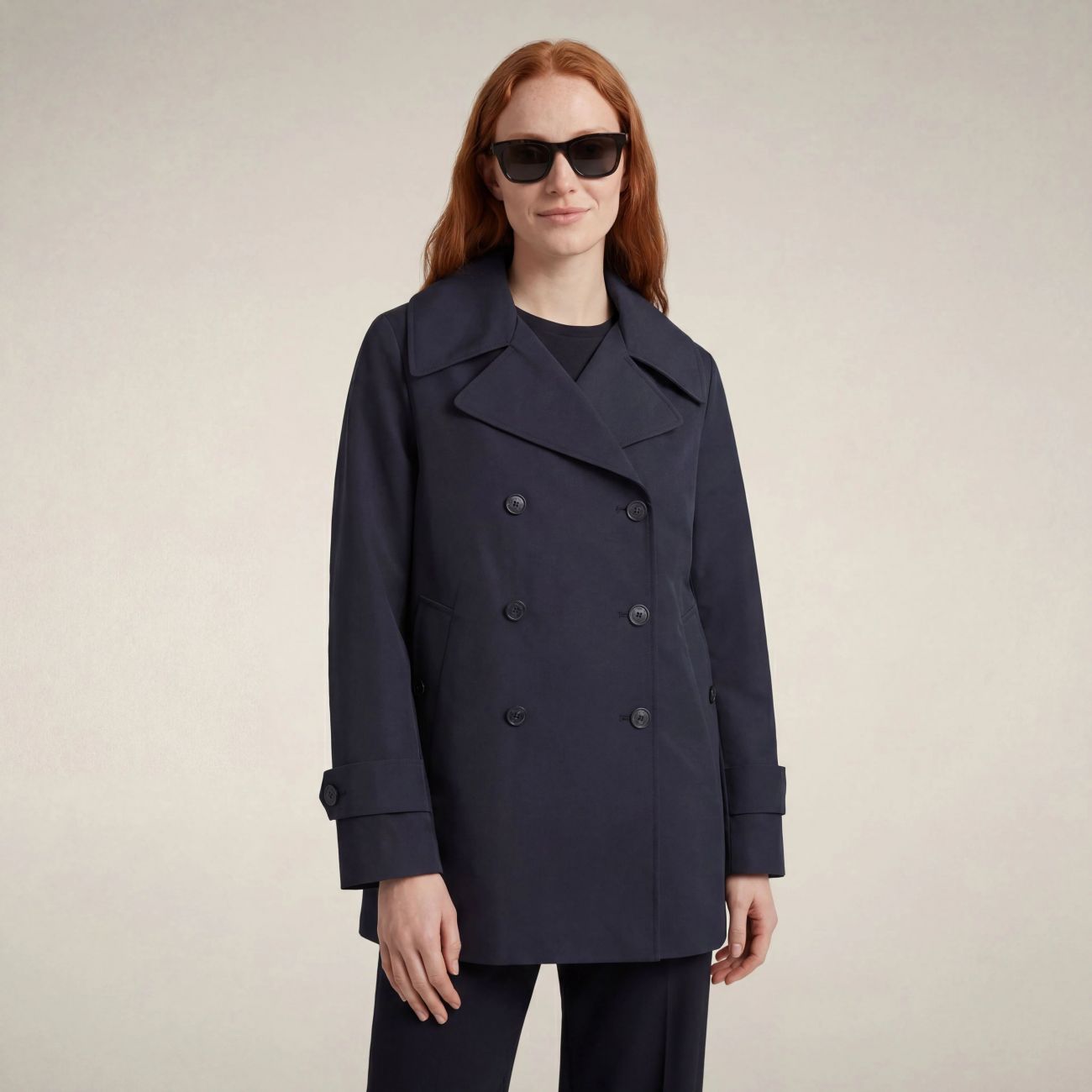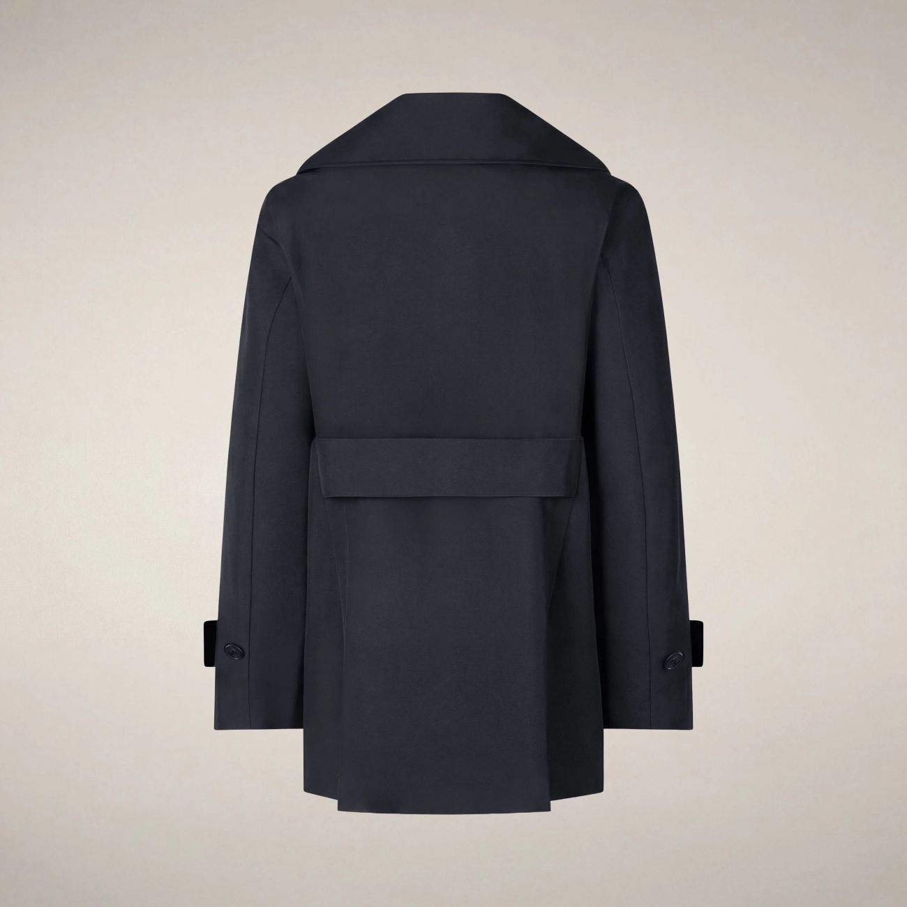 Il trench corto da donna modello Sofi rivisita il classico raincoat all'inglese con ampio revers e martingala sul retro. Perfetto per la pioggia grazie al tessuto tecnico e alle cuciture nastrate, si presenta con chiusura doppiopetto e cinturini regolabili ai polsi. I bottoni personalizzati neri con finitura gommata e il logo rotondo sulla manica sono l'inequivocabile firma del nostro stile animal free. 100% recycled polyester 3-layer fabric with a matte finish. Lightweight and robust, thanks to the laminate it guarantees water resistance (10000 mm/H2O), breathability (3000 g/m²/24h) and wind protection.