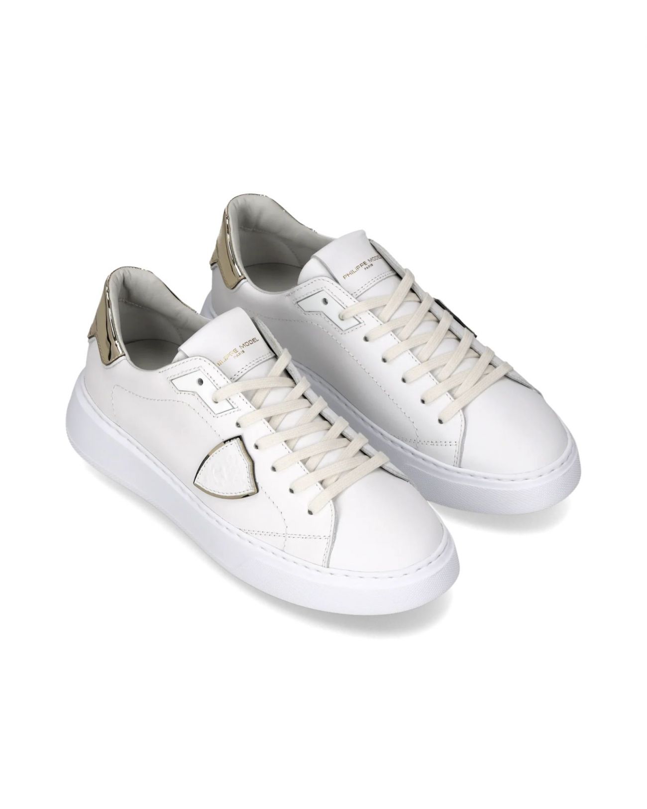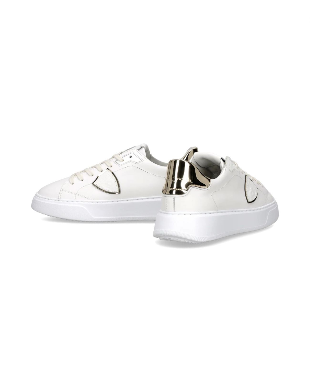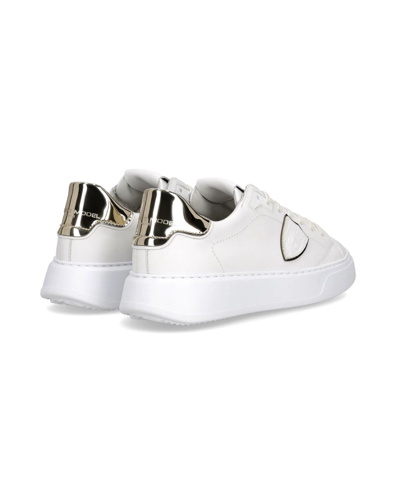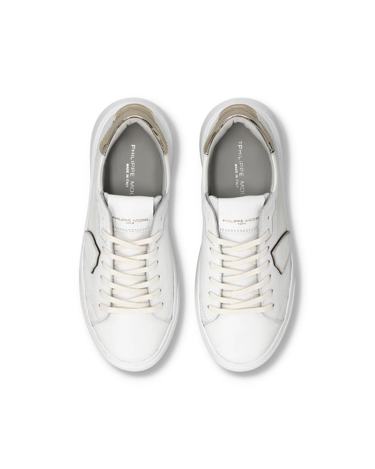 In una raffinata palette bianco e oro, Temple esprime uno stile street rivisitato con eleganza. Le forme pulite e i volumi decisi di questa sneaker con suola alta da donna richiamano l’estetica dei modelli nineties, reinterpretati in chiave contemporanea. La tomaia in morbido vitello bianco è completata da uno spoiler in pelle vinile oro che riprende il sottoscudo, mentre i lacci glitterati aggiungono un tocco luminoso e distintivo. La suola è in gomma ultraleggera. Materiali: Sneaker in vitello con spoiler in pelle vinile metal. Sottopiede in memory con costruzione estraibile, fodera interna in pelle spugna di cotone. Suola in gomma ultra leggera con altezza al tallone. Composizione: 90% CALF LEATHER - 10% TEXTILE Suola: 4 CM