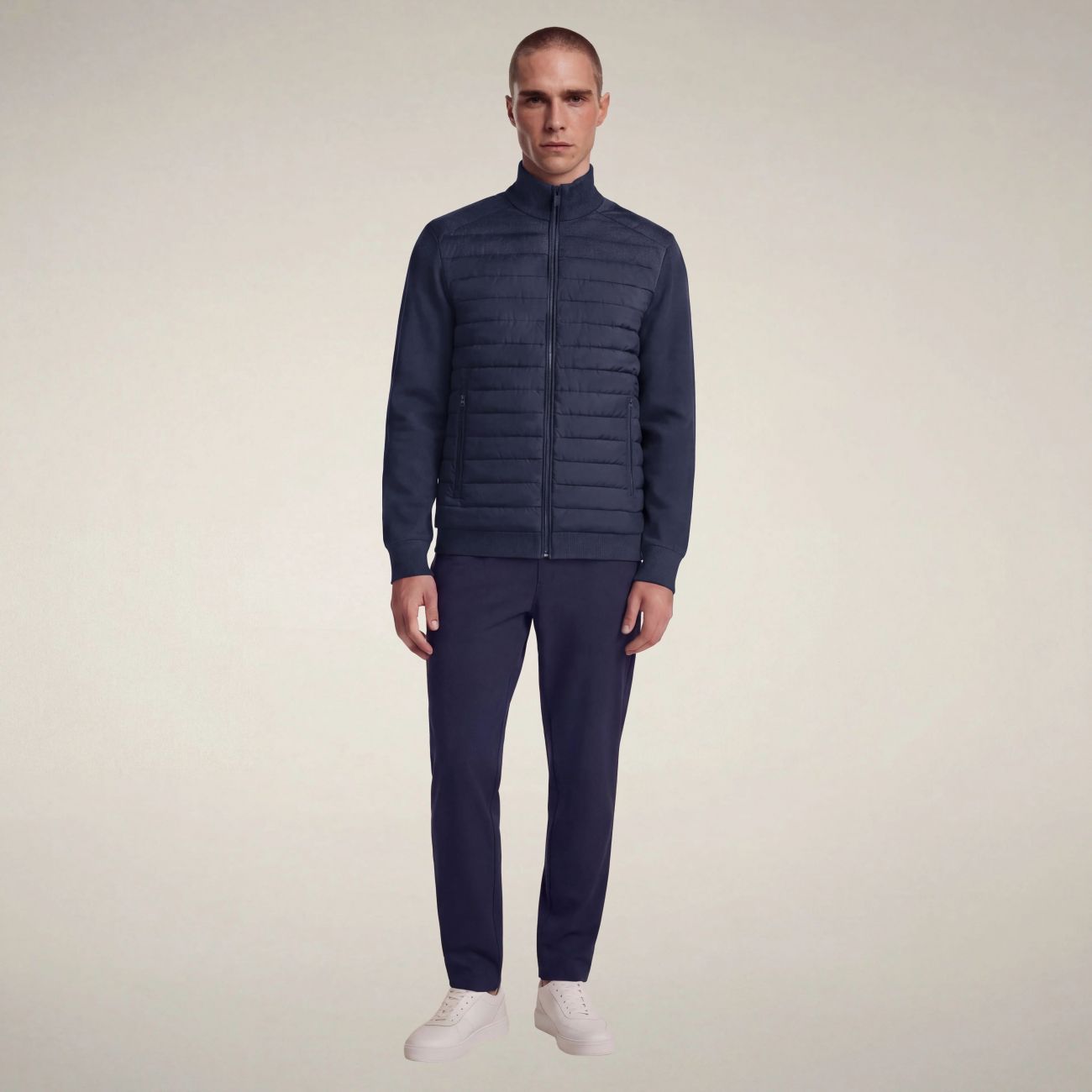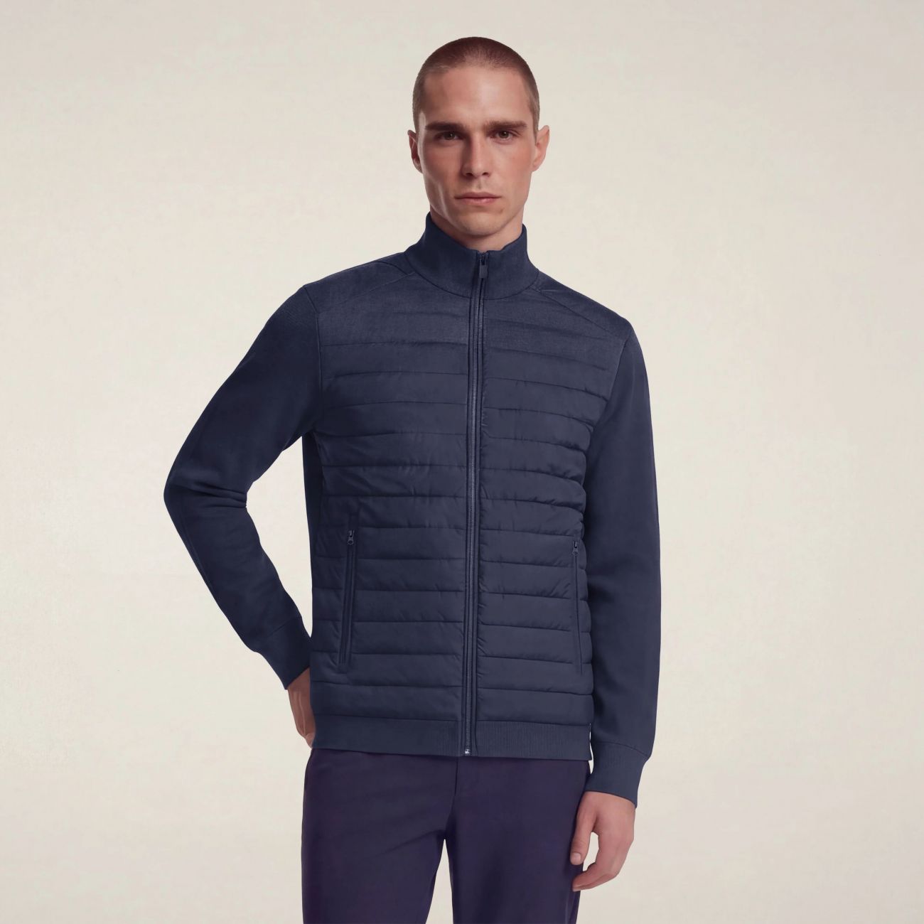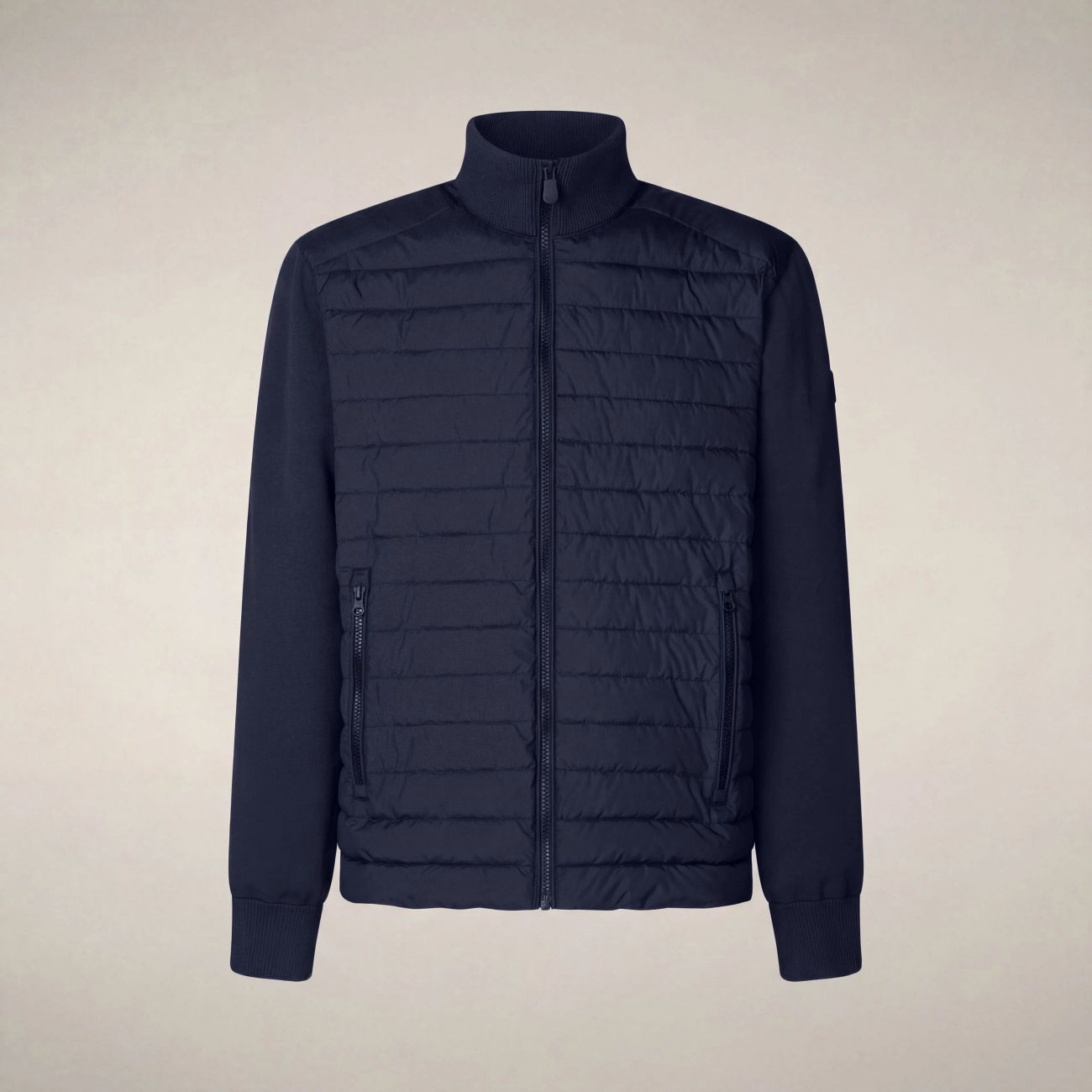 La giacca uomo modello Sedum si distingue per il design ibrido, che combina il pannello frontale trapuntato e maniche e retro in maglia compatta. Le tasche laterali con zip offrono praticità, mentre il collo alto a costine garantisce protezione extra. Il logo tono su tono sulla manica sinistra e il tiretto personalizzato completano il look con caratteristici dettagli Save The Duck. Tessuto combinato composto da MIRO (100% poliestere riciclato) e KNIT (100% poliestere riciclato lavorato a maglia).