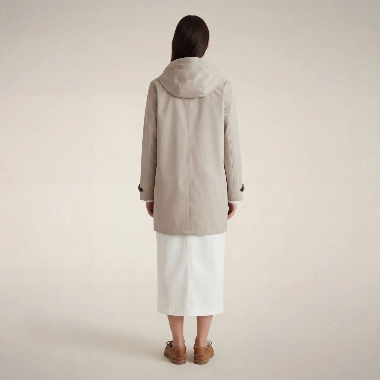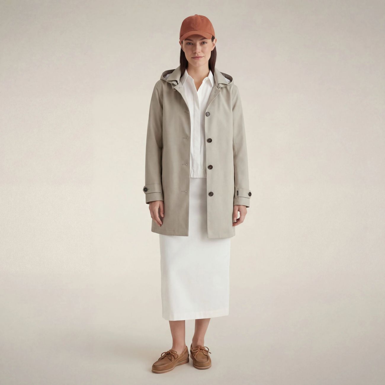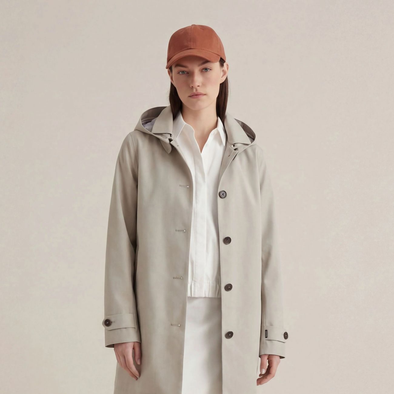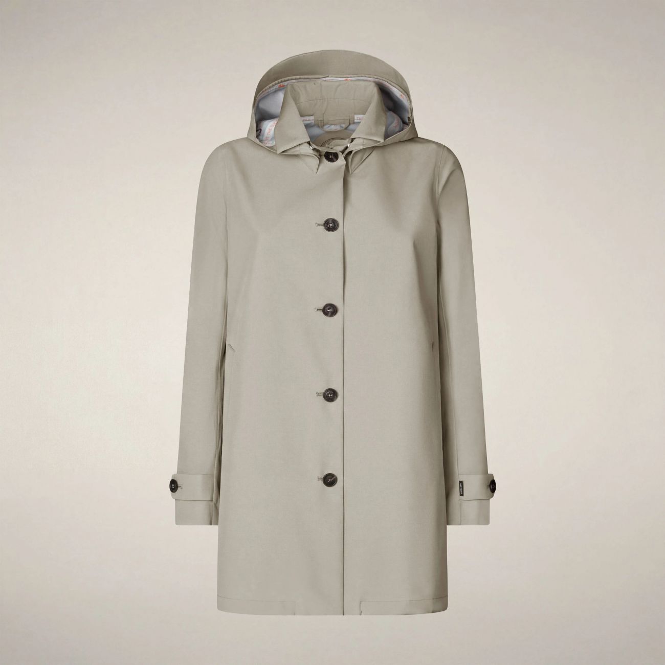 L'impermeabile donna modello April fonde comfort e protezione nel segno dello stile animal free. Leggero e versatile, presenta cappuccio rimovibile e regolabile, cuciture nastrate, cinturini con doppio bottone ai polsi e tasche laterali in stile trench. I bottoni gommati neri con logo inciso e il badge rotondo sul cappuccio fanno da firma distintiva. 100% recycled polyester 3-layer fabric with a matte finish. Lightweight and robust, thanks to the laminate it guarantees water resistance (10000 mm/H2O), breathability (3000 g/m²/24h) and wind protection.