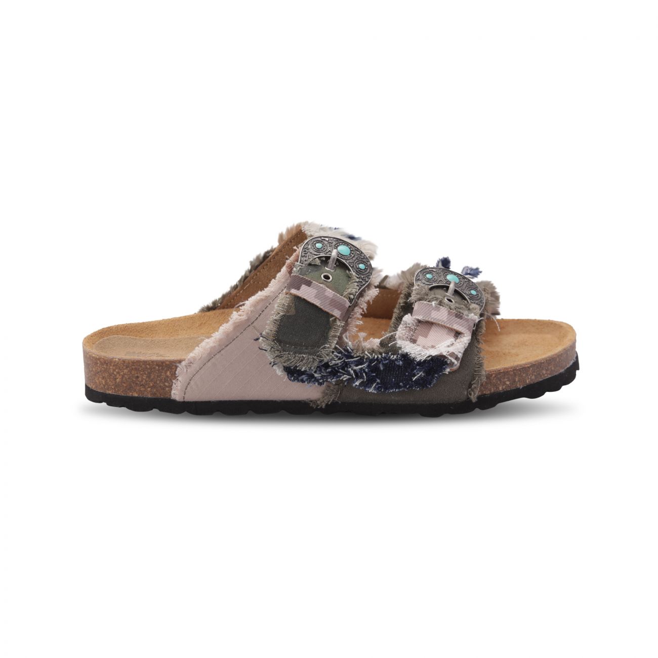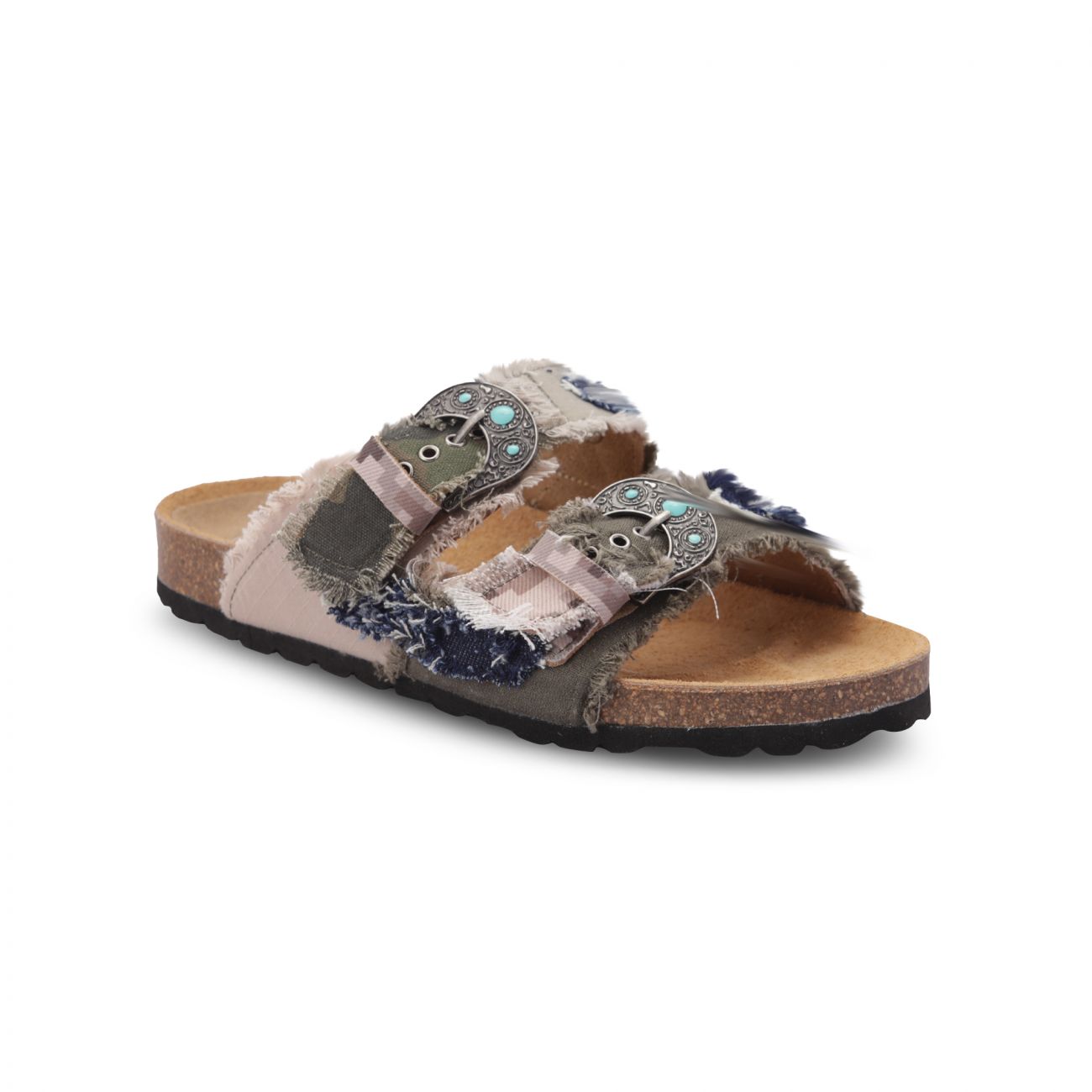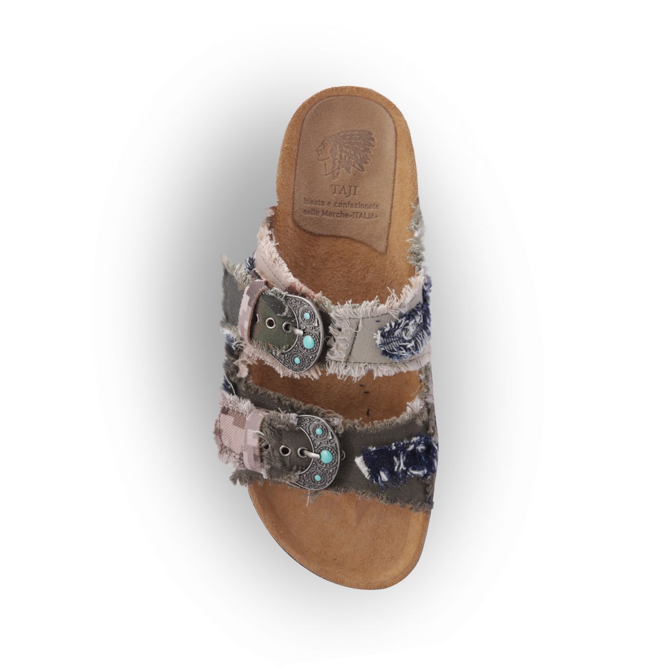 Sandalo a 2 fasce con le fibbie con pietre color turchese, tomaia in patch jacket mimetico foderata in pelle di vitello e suola anatomica