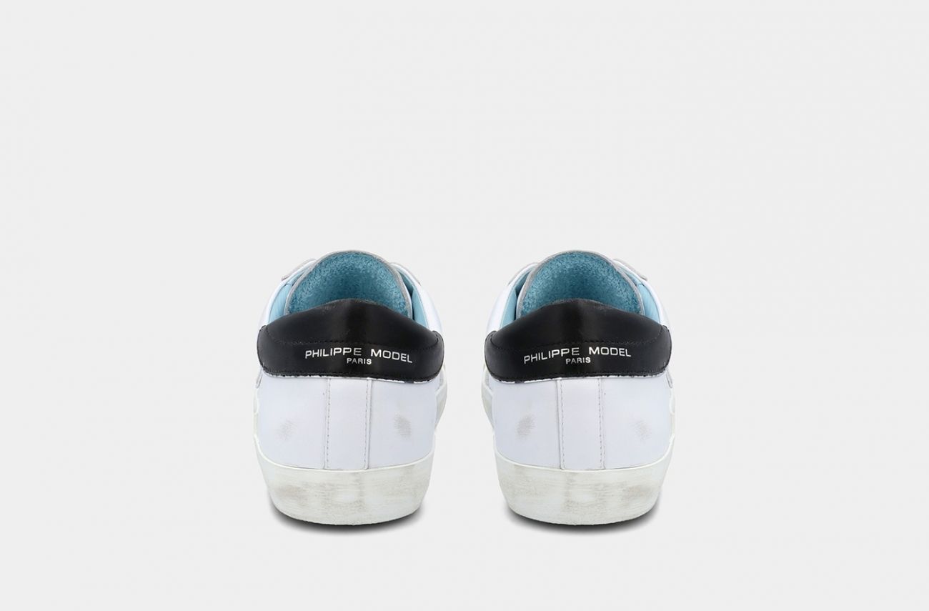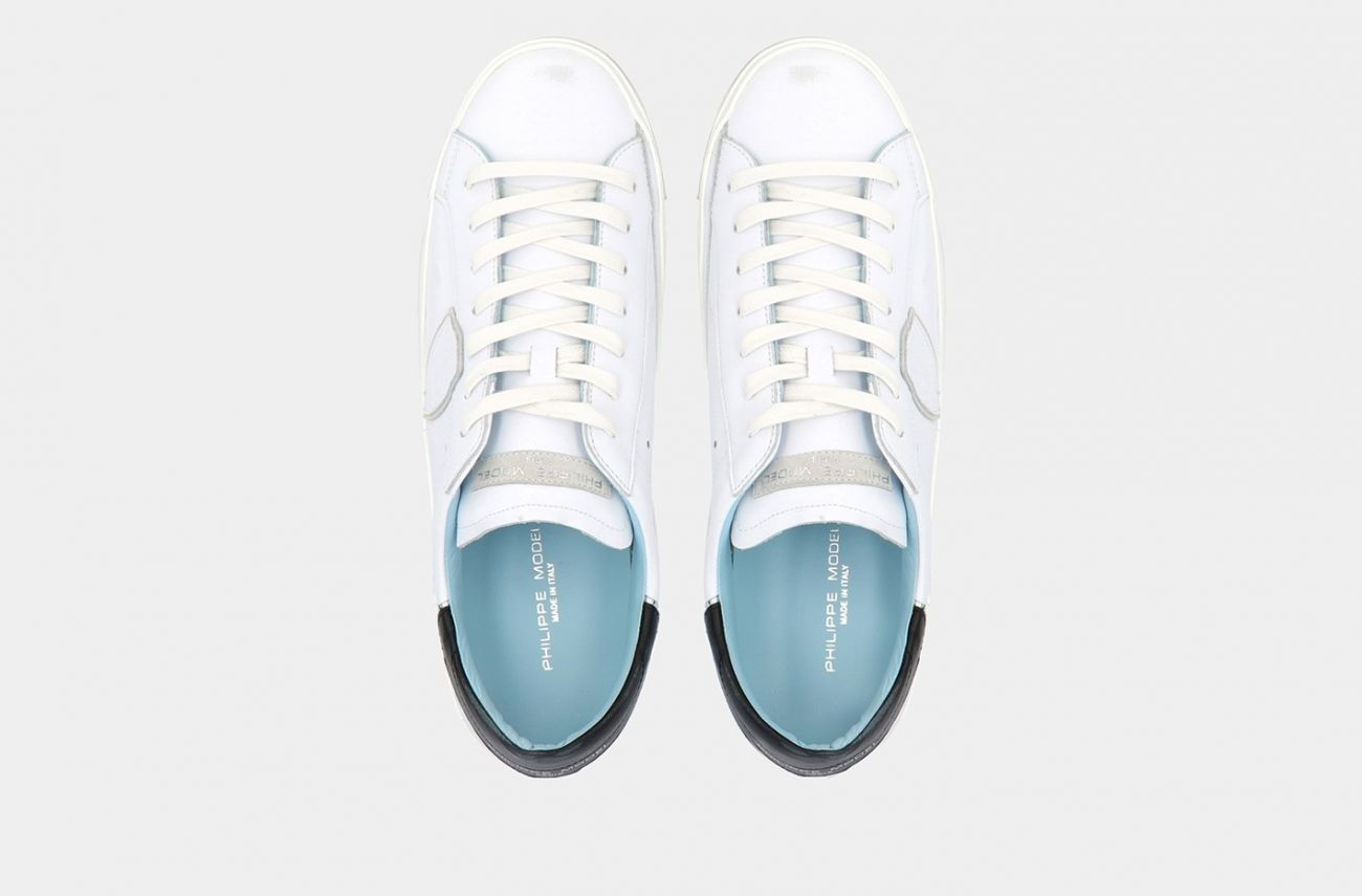Il concetto di vissuto come sinonimo di artigianalità trova nella PRSX la sua espressione massima, grazie alla particolare fasciatura della suola, volutamente imperfetta e per questo brevettata dal marchio. Lo scudetto sul lato della scarpa rappresenta il blasone della Città di Parigi, dove Philippe Model lanciò il suo brand. La tomaia è realizzata in pelle di vitello e suede, con inserti di tessuto a specchio, fodera azzurra "Philippe Model" e sporcature ad effetto vintage. Il laccio è di colore bianco con effetto consumato. La suola, alta 2,5 centimetri, è realizzata in gomma spazzolata con effetto vintage. Philippe Model Paris utilizza materiali e pellami di origine italiana. Il tutto all'insegna del "Fatto con cura in Italia".